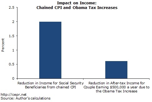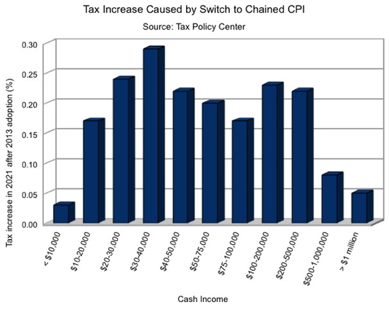 Chaining the CPI may also amount to a subtle tax increase for the middle class, assuming that the new method will be applied to the way IRS calculates tax brackets. Over time, the brackets will rise more slowly and, as incomes gradually increase, folks will slip more quickly into higher brackets.