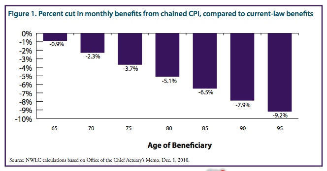 Security check was $1,250 last year, it increased to $1,271.25 this year. Were the Chained CPI in effect it would be $1,267.50, amounting to $45 less a year. Again, that might not seem like a big reduction, but if the COLA is the same next year, the difference increases to $91.32 for the next year. And as the SSI checks get smaller and smaller, inflation will drive prices higher.