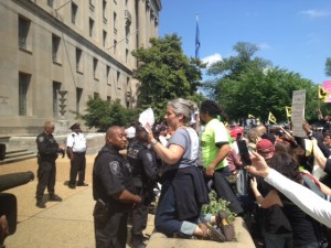 Homeowners affiliated with Alliance for a Just Society and the Home Defenders League joined with Occupy our Homes to bring homeowners directly impacted by the crisis to DC. Their goal: to tell the Department of Justice that in the United States there is no bank and no bank CEO who should be considered above the law. Seventeen homeowners were arrested.