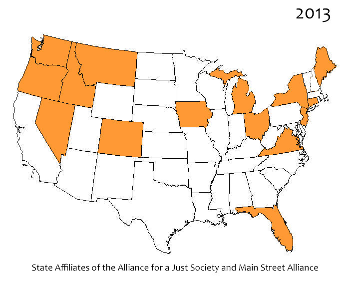 As of this year, we are proud to note the following states affiliated with the Alliance for a Just Society and Main Street Alliance: Washington, Oregon, Idaho, Nevada, New York, Virginia, Michigan, Ohio, Iowa, Maine, Florida, Colorado and Connecticut.