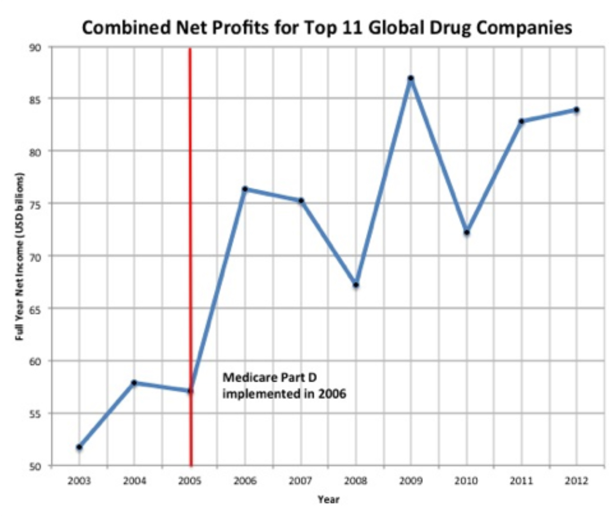 Congress passed Medicare Part D, a prescription drug “benefit” program for seniors, in 2003. This may initially sound like a blessing for seniors, but, among other pitfalls, the bill prevented Congress from negotiating drug prices under Medicare. Instead of ensuring that Medicare