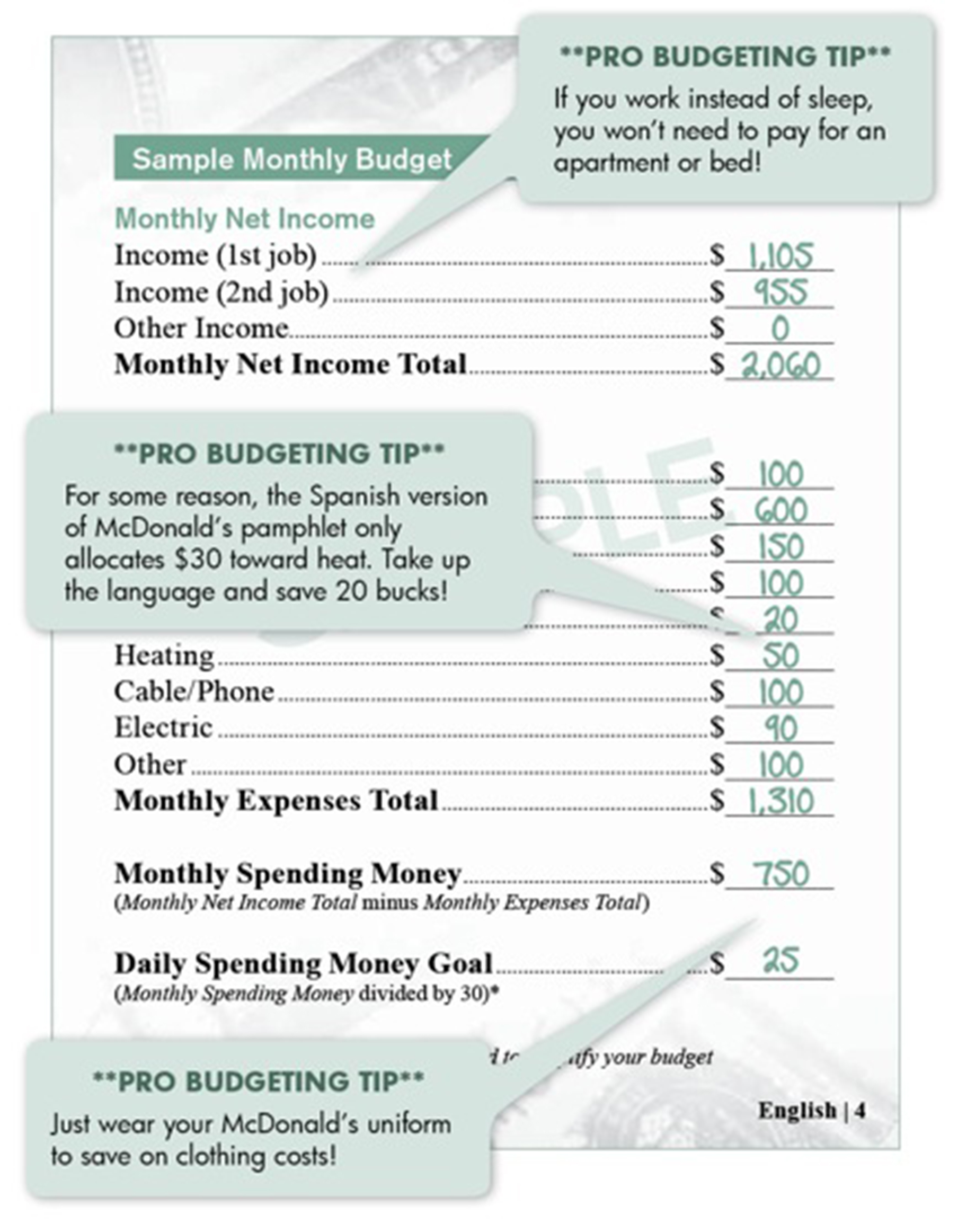 As we see with their handy budget guide, even McDonald’s expects employees to get a second job. We hear the job market is tight — but that’s a pretty lame excuse.