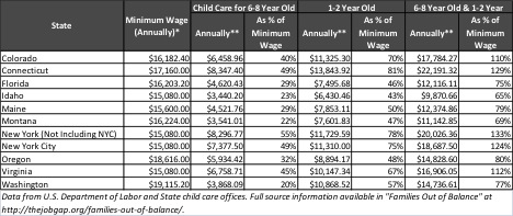The cost of child care for a school age child and a toddler is equal to more than 65 percent of a full-time minimum wage worker’s earnings in the 10 states included in the Alliance’s November 2014 report, “Equity in the Balance,” and is over 100 percent of their earnings in Colorado, Virginia, Connecticut, and New York.
