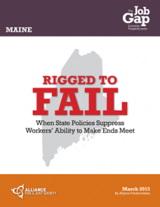 Rigged to Fail – Maine Posted byAJS adminMay 21, 2015Posted in2015 Pubs, Allyson Fredericksen, Economic Justice Pubs, Job Gap Rigged to Fail: When State Policies Suppress Workers’ Ability to Make Ends Meet March 2015 By Allyson Fredericksen