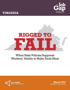 Rigged to Fail – Virginia Posted byAJS adminMay 21, 2015Posted in2015 Pubs, Allyson Fredericksen, Economic Justice Pubs, Job Gap Rigged to Fail: When State Policies Suppress Workers’ Ability to Make Ends Meet March 2015 By Allyson Fredericksen