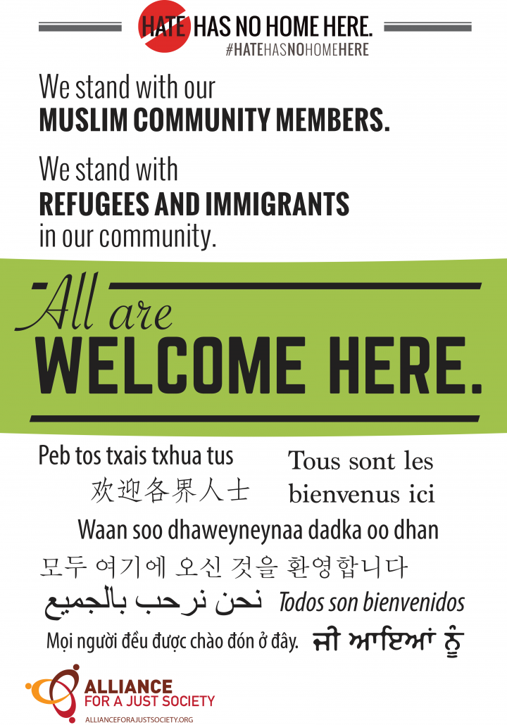 The Alliance for a Just Society joins with Main Street Alliance and businesses all around the country who are standing up to racist and anti-Muslim rhetoric from political candidates and others in recent weeks. We reject collective punishment for individual acts and join other in saying “Hate has no business here” and “Hate has no home here.”